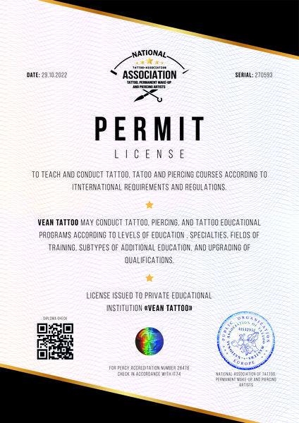 Despite the fact that diplomas of educational schools working in the industry of tattooing, permanent make-up and piercing are not registered in the unified state register.