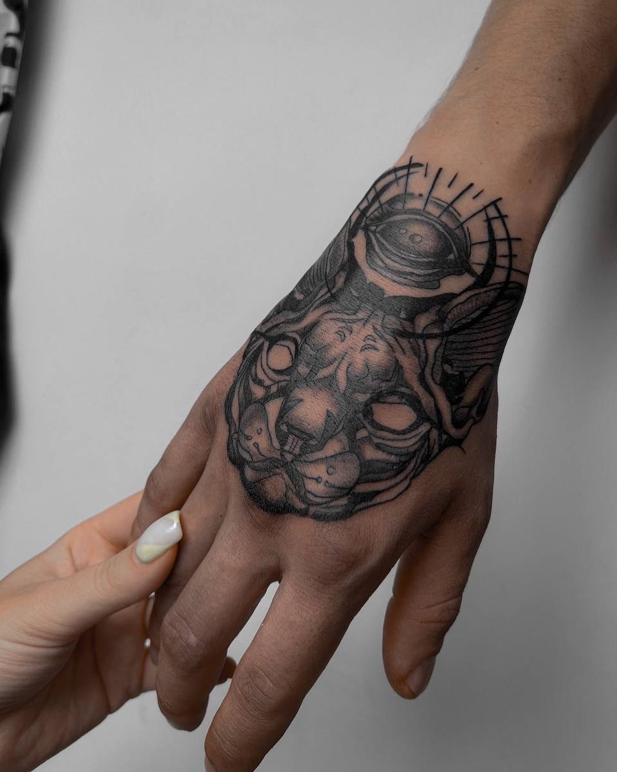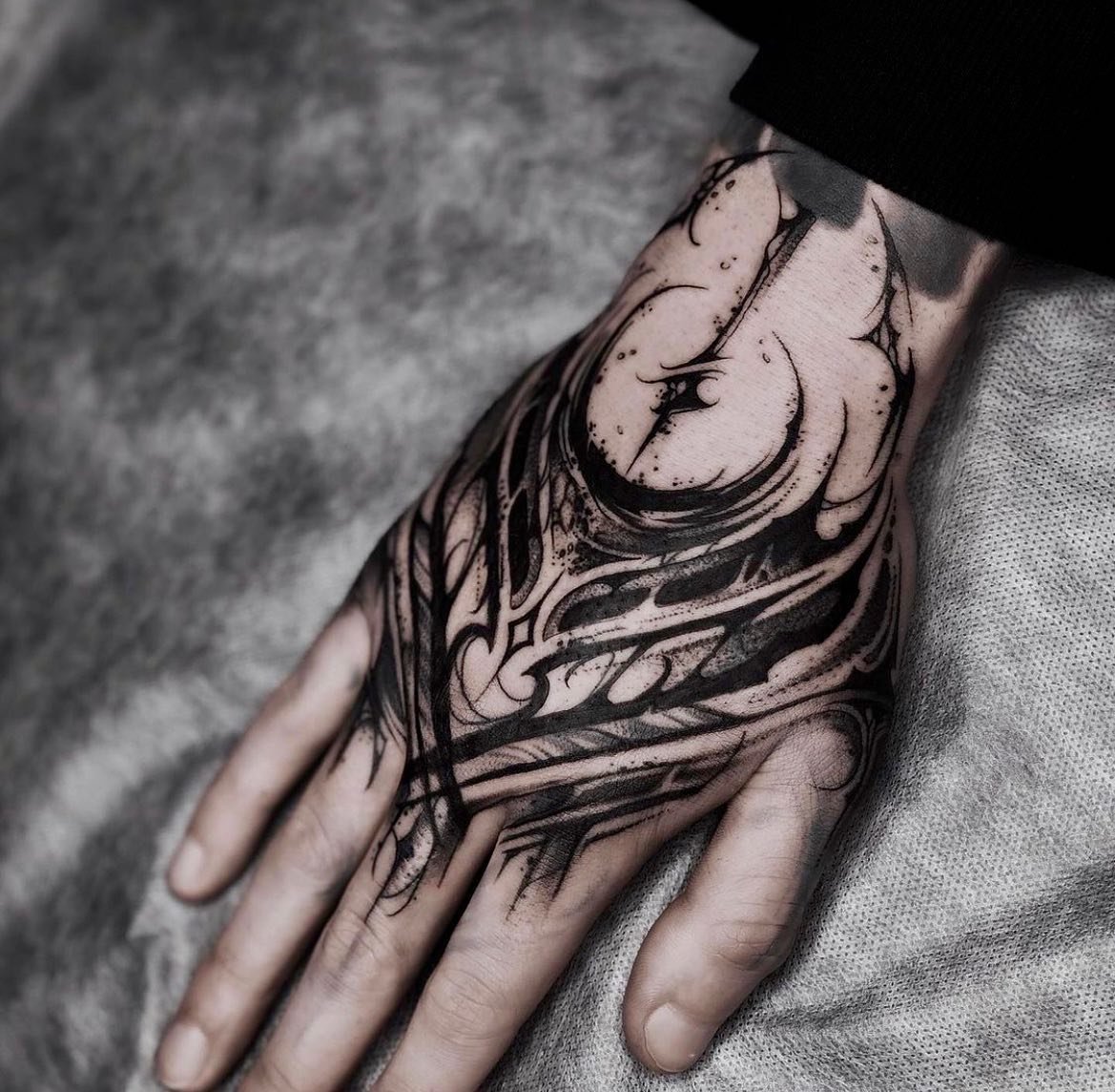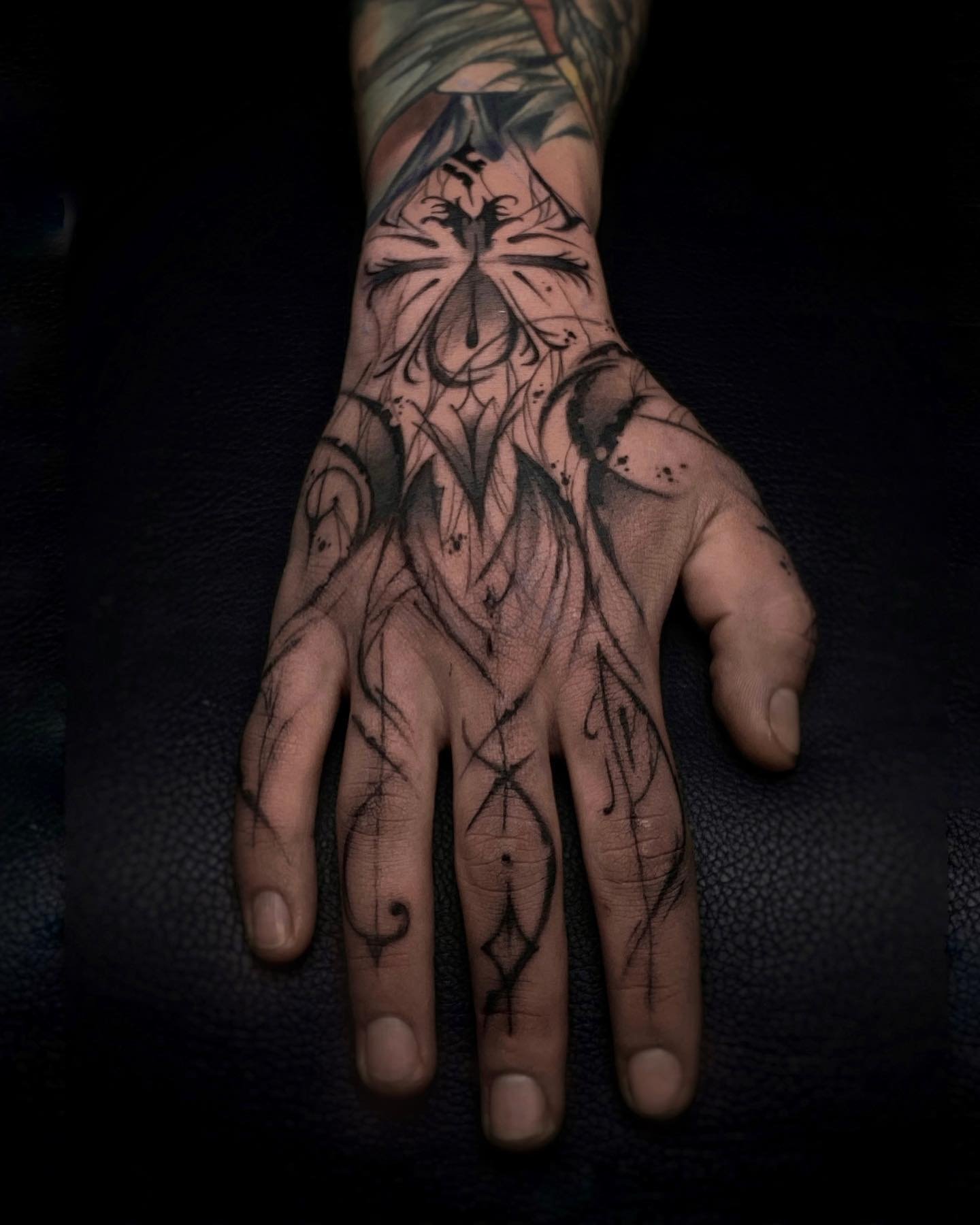 Often this is a large drawing of a rose, a skull, a mandala. If you have found a sacred meaning in such designs for yourself, then feel free to tattoo them. However, if you just want your hand to get inked and later go up or the hand tat to be the final stroke of something much bigger, then look for yourself or consult with your artist about a less trivial design.