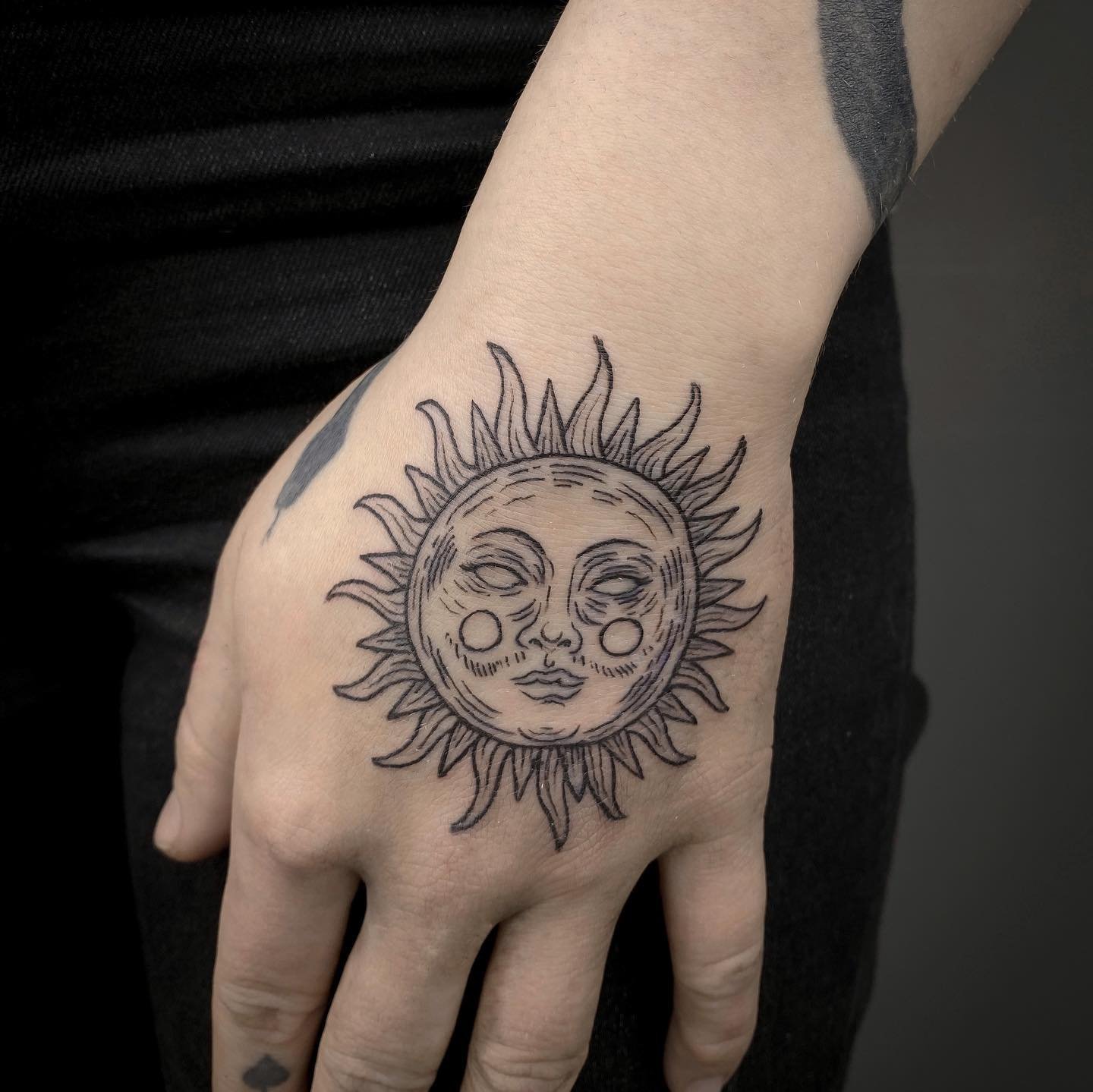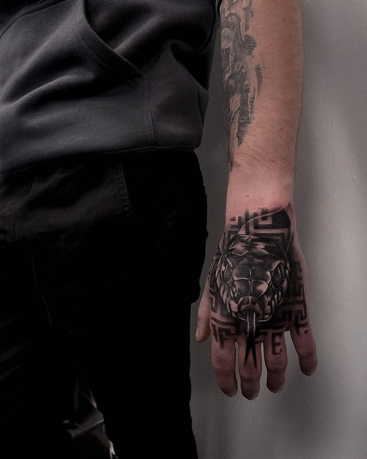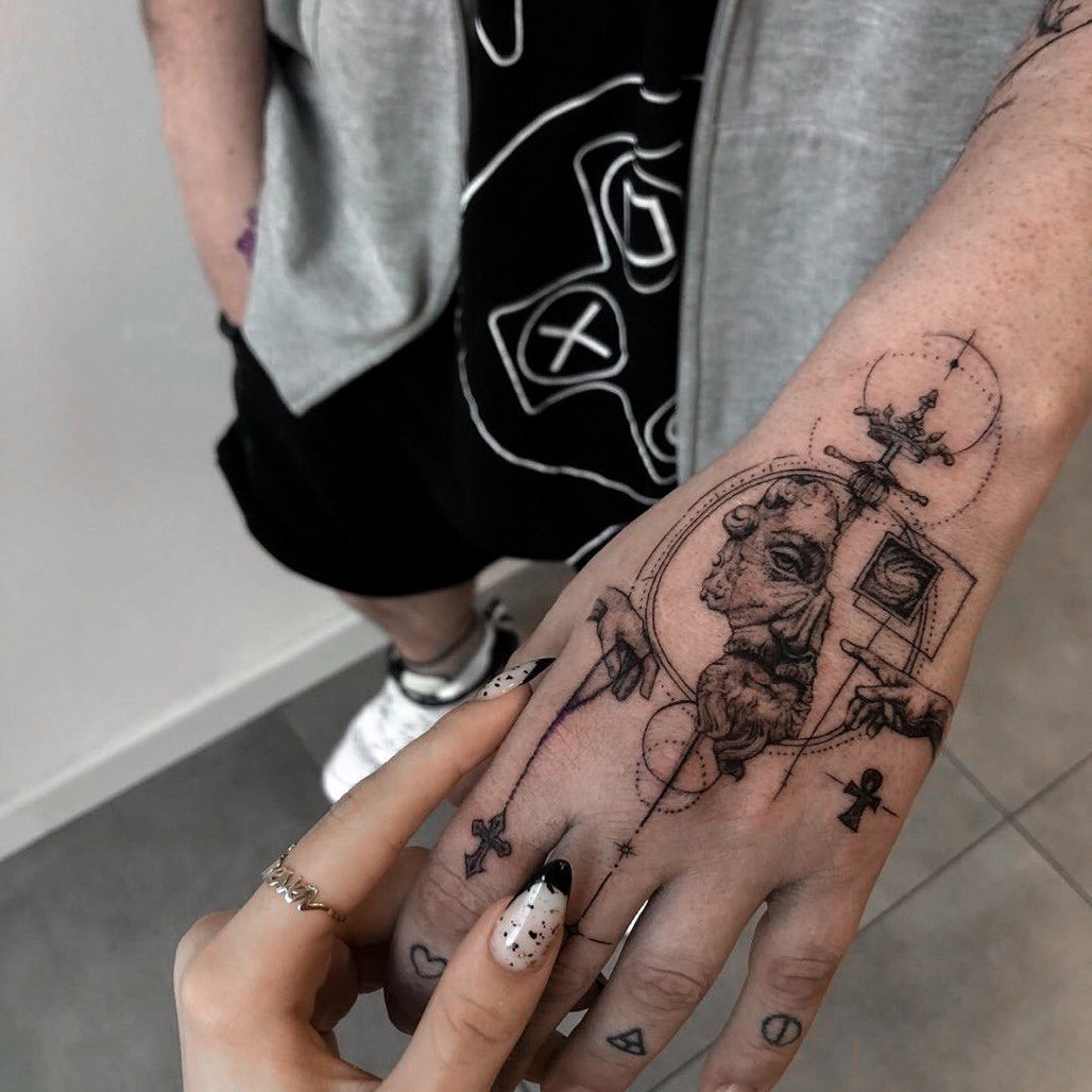 Often this is a large drawing of a rose, a skull, a mandala. If you have found a sacred meaning in such designs for yourself, then feel free to tattoo them. However, if you just want your hand to get inked and later go up or the hand tat to be the final stroke of something much bigger, then look for yourself or consult with your artist about a less trivial design.
