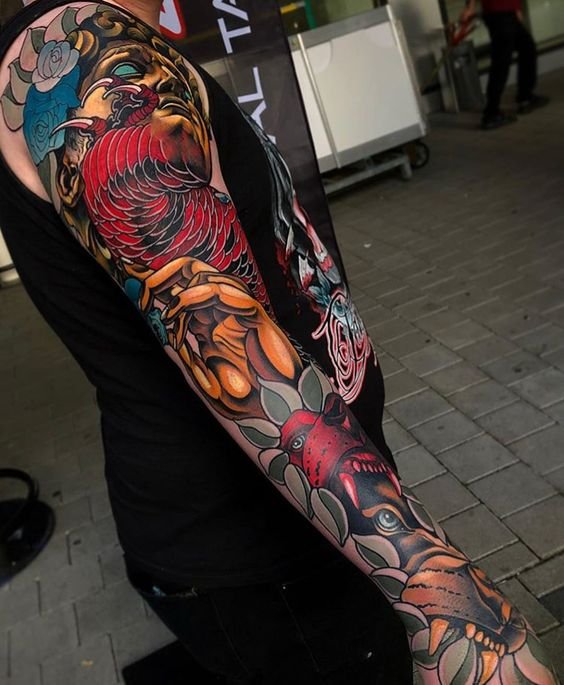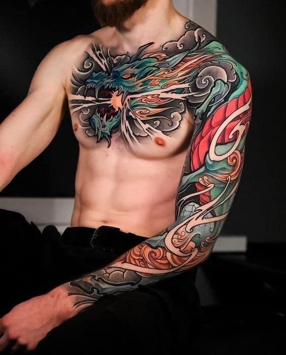 The subject of a Japanese tattoo is a character or creature depicted in the foreground.