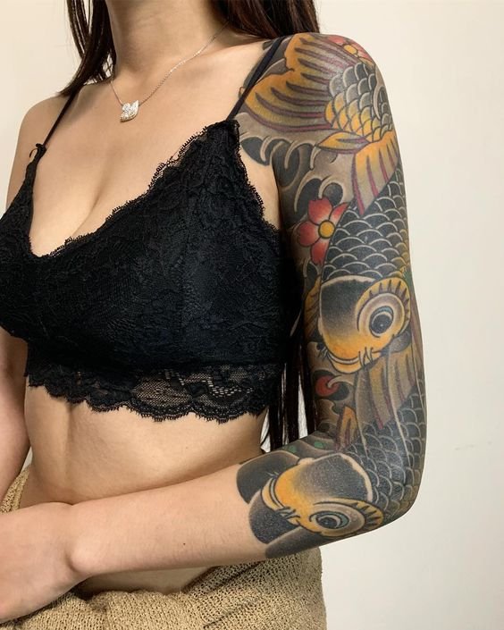 - This symbol on the body speaks of the strength, resilience, luck, transformation and power of its owner. Koi are tattooed in different colors, accompanied by maple leaves, lotus flowers, stones and water.