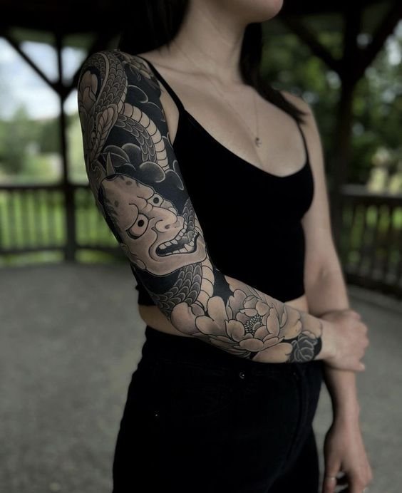 - The mask used in Japanese theater has become a popular subject of tattoos. The actor took a theatrical mask to show how the female character had lost his emotions and anger because of the lover’s deception. Because of her vivid appearance, Hannya is often used in large-scale tattoos and as an independent element of a small image.