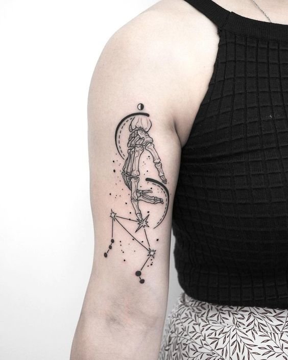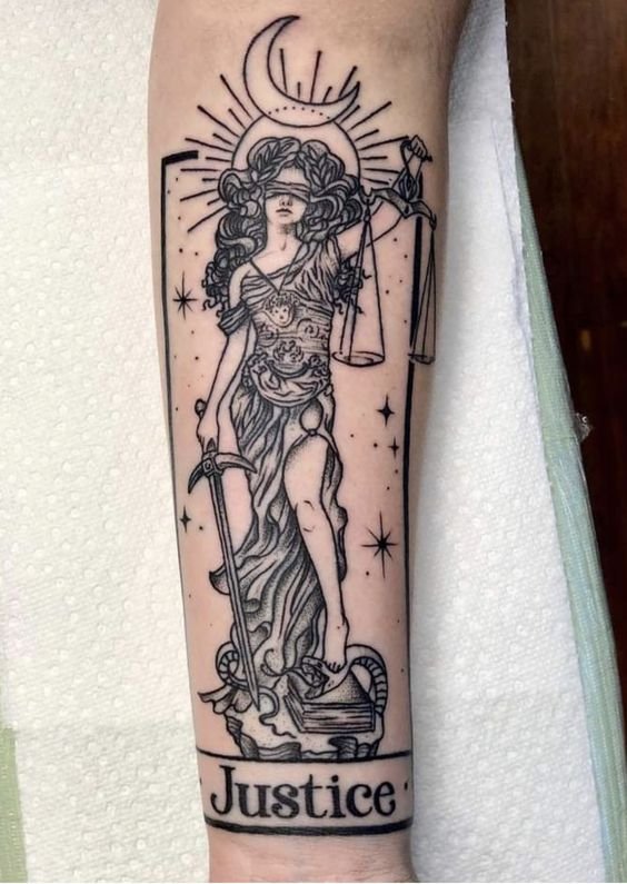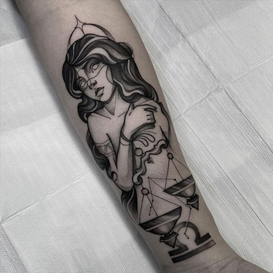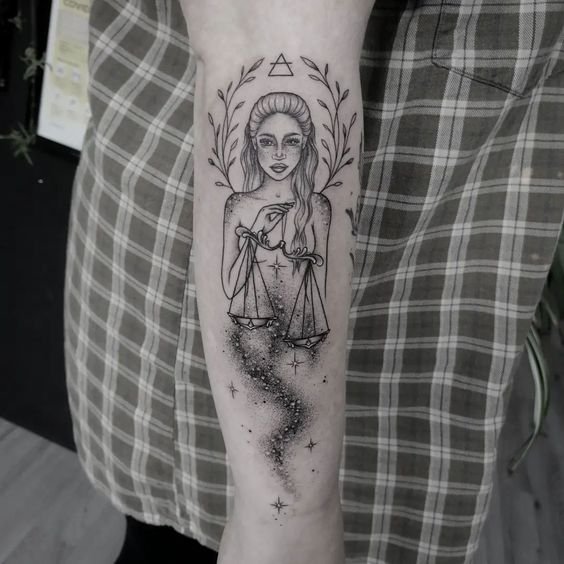 Apart from this, Libra is frequently associated with the goddess of justice, Themis. You can also add to your tattoo sketch constellations or zodiac-related inscriptions.