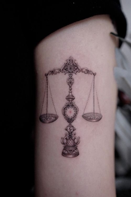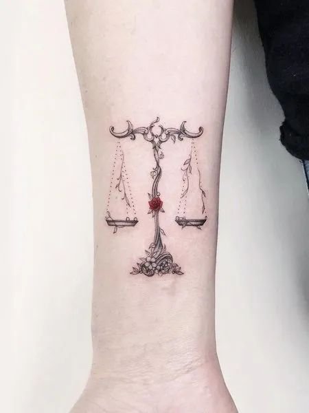 The meaning of the Libra tattoo also depends on the balance between the two parts of the scales. If they are equal, a person is likely to strive for harmony and tranquillity. However, one of the scales outweighs the other, this may indicate a person's preferences in life. For example, if a heart lies on this side, then the tattoo indicates that for the tattoo owner, romantic relations are currently in the first place.