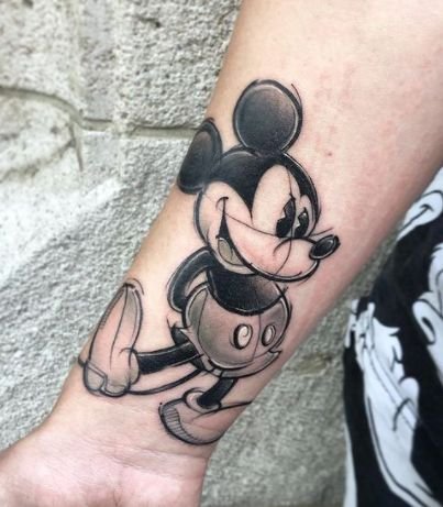 - Such tattoos are characterized by black outlines, realistic colours, and minimal shading. In these sketches Mickey is frequently combined with skulls, roses, and various inscriptions ;