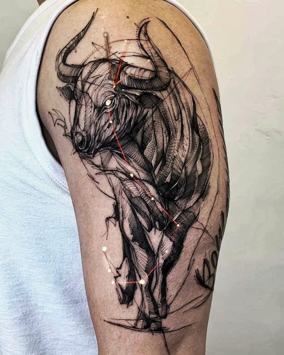 Since bull is associated with aggression and cruelty, women are not big fans of such tattoos. At the same time, men usually choose Taurus sketches to emphasize their brutality and purposefulness.