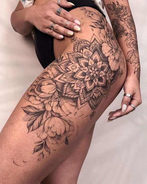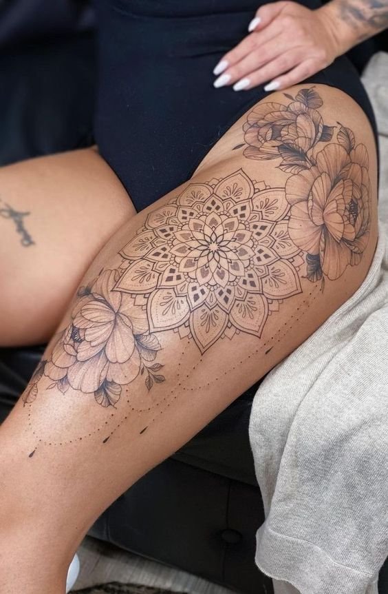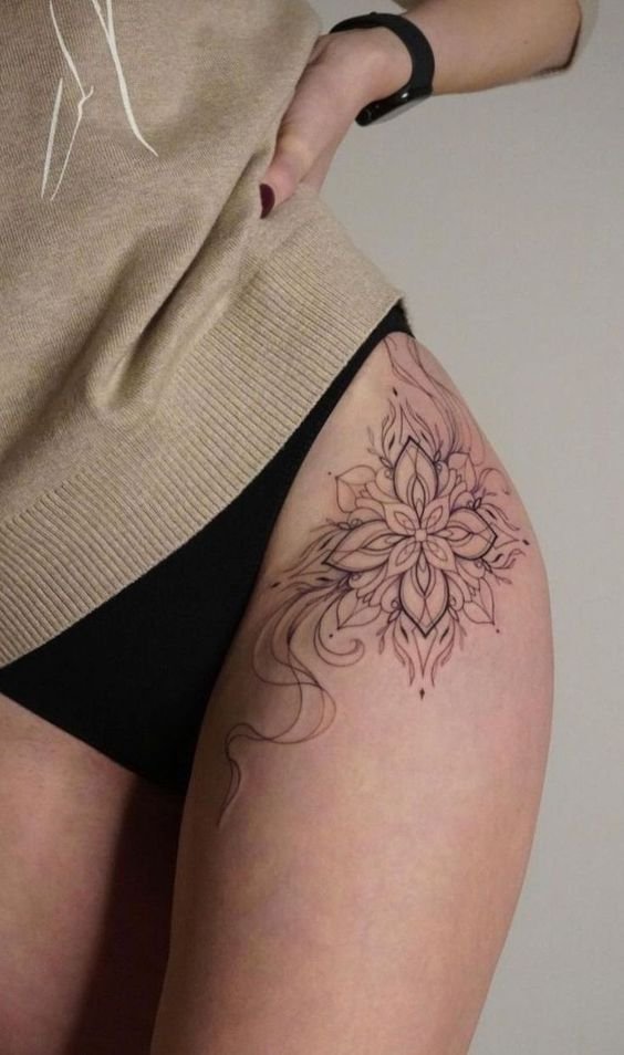 A mandala is a tattoo usually created in the form of a circle with various geometric elements from the outer and inner sides. The meaning of a female thigh mandala tattoo depends on its elements. For example, squares and triangles symbolize feelings and emotions, while round figures are associated with integrity and personality.