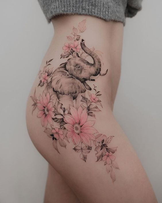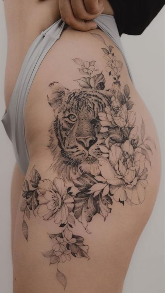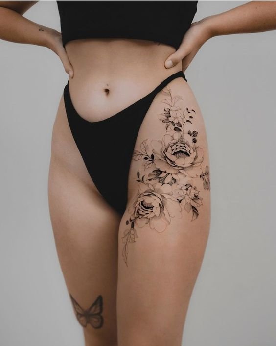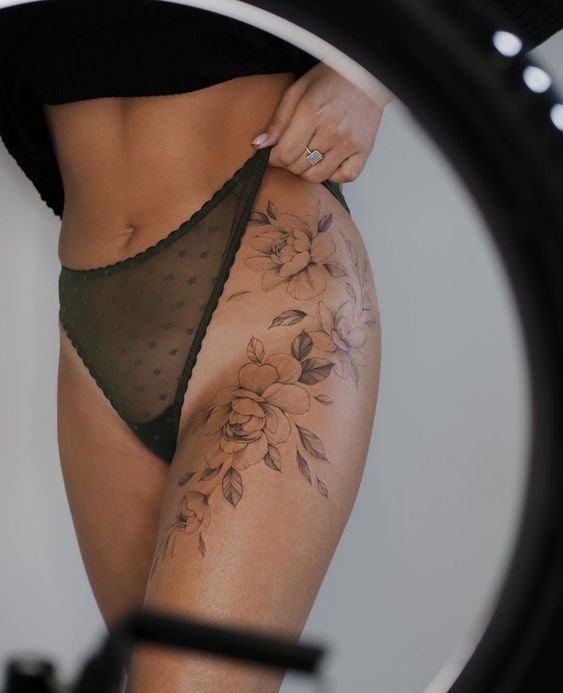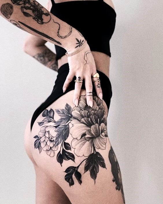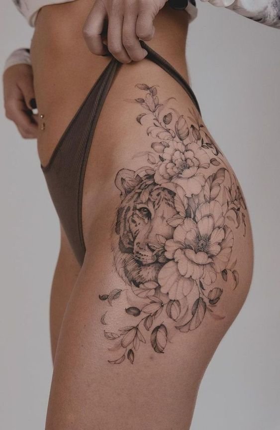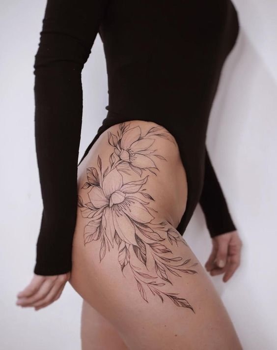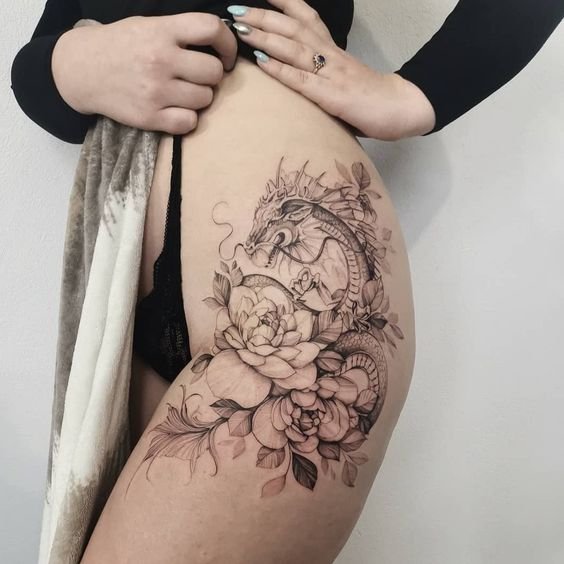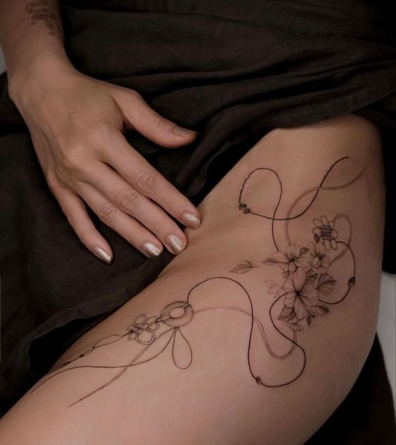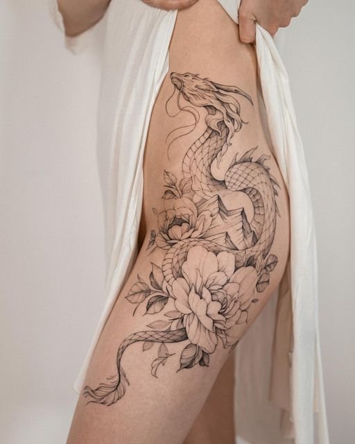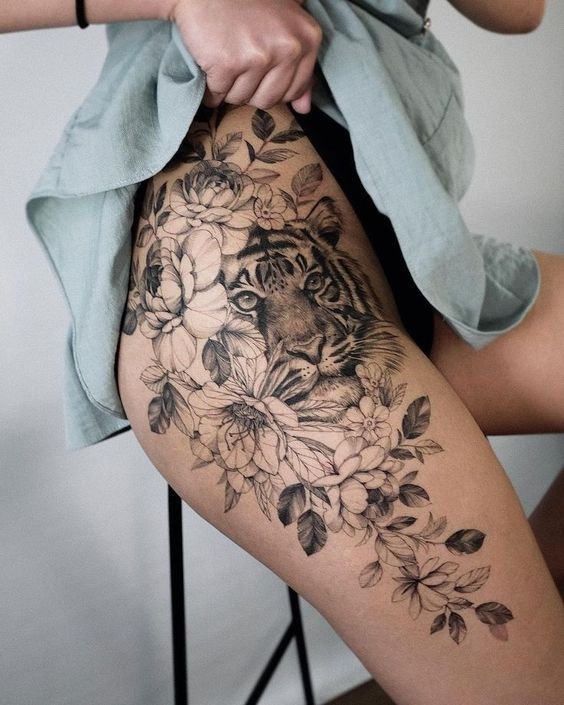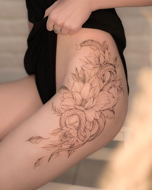 Thigh tattoos for women usually contain flowers. Roses, peonies, daisies, lotuses – you can turn any plant into an eye-catching tattoo sketch. It is believed that such thigh tattoos look elegant and feminine. However, if you combine flowers with a sworn or a snake, its overall perception will change.