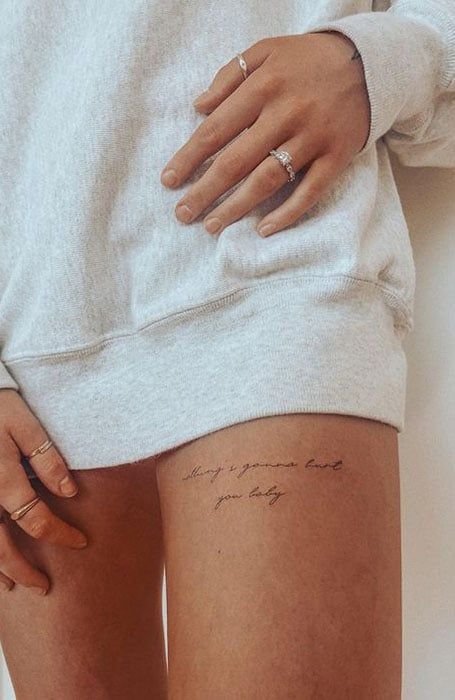 Thigh tattoos are usually associated with large sketches with numerous elements. In fact, many women are not ready for such radical actions and prefer small tattoos. Among the most popular minimalistic options are: thought-provoking inscriptions, constellations, small figures, twigs, wings, and the like.