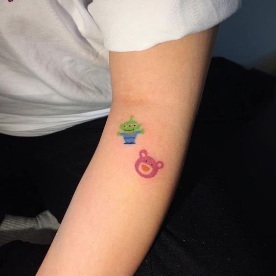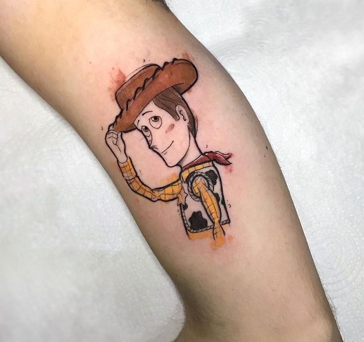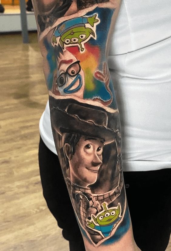 - Colourful forearm Toy Story tattoo;