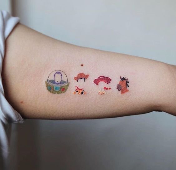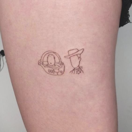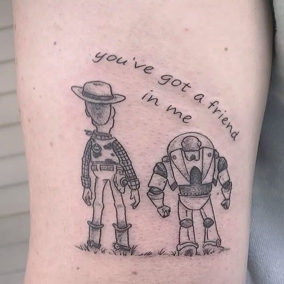 In most cases, Toy Story sketches are large, colorful, and massive. Such tattoos may include several elements and even a background. However, if you are a fan of minimalistic body illustrations, you can get a tattoo with a famous Woody`s lyrics, “You have got a friend in meee!”. Such a Toy Story tattoo will look especially attractive on the neck, wrists, and ribs. This idea may also be used for matching tattoos.