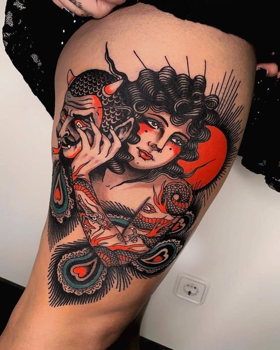 - Dragons, mermaids, demons - anything related to legends and myths of different cultures can become the subject of your tattoo in traditional style.