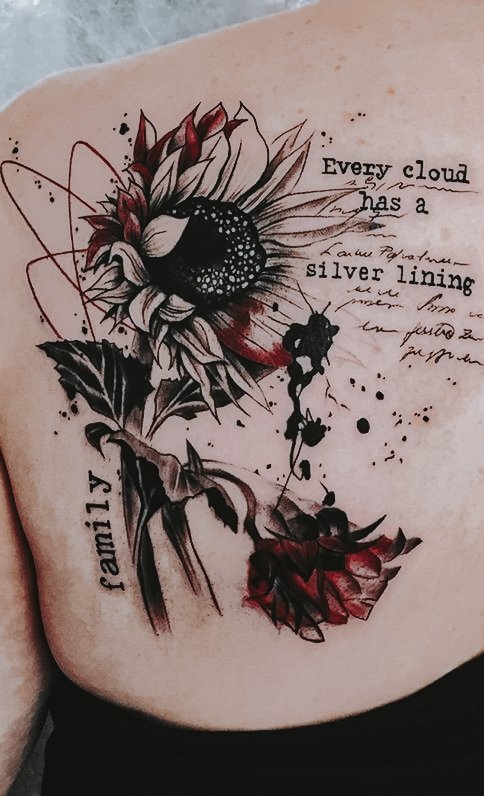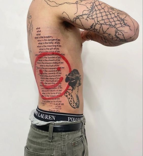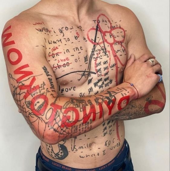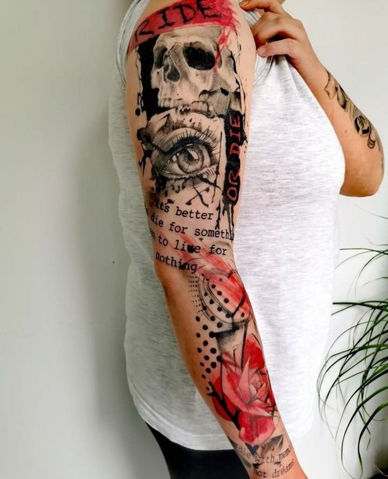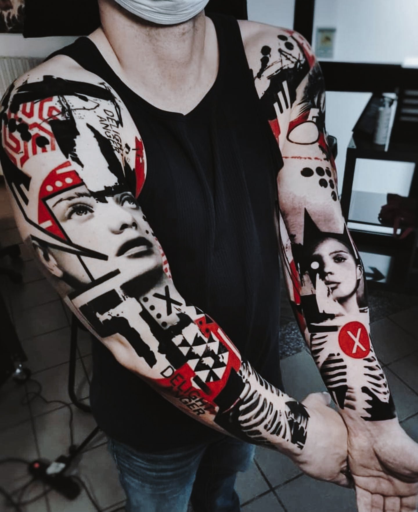 Trash Polka tattoo requires a large «canvas» due to the small details that define the style, such as the typewriter font. That is, the image is applied on a sleeve, a leg or a significant part of the body.