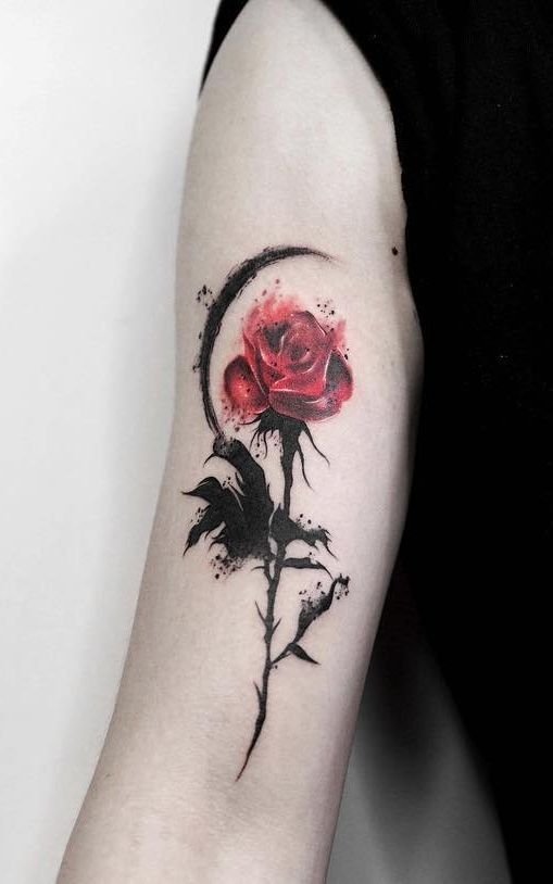 Rose with spikes. The tattoo of this flower is an interesting option because of the beauty of the scarlet rose, contrasting with black leaves and spikes. Lines and colors are combined to emphasize the many facets of temptation, love, passion.