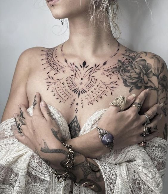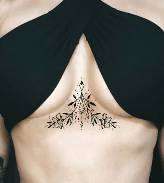- Varieties of ornaments are placed between the breasts. Such designs are usually big. Ornaments are placed directly under the breasts. The tattoo successfully highlights breast shape. You can place ornaments not only in the center, but also on the side of the chest. Ornaments are often complemented by other elements like precious stones.