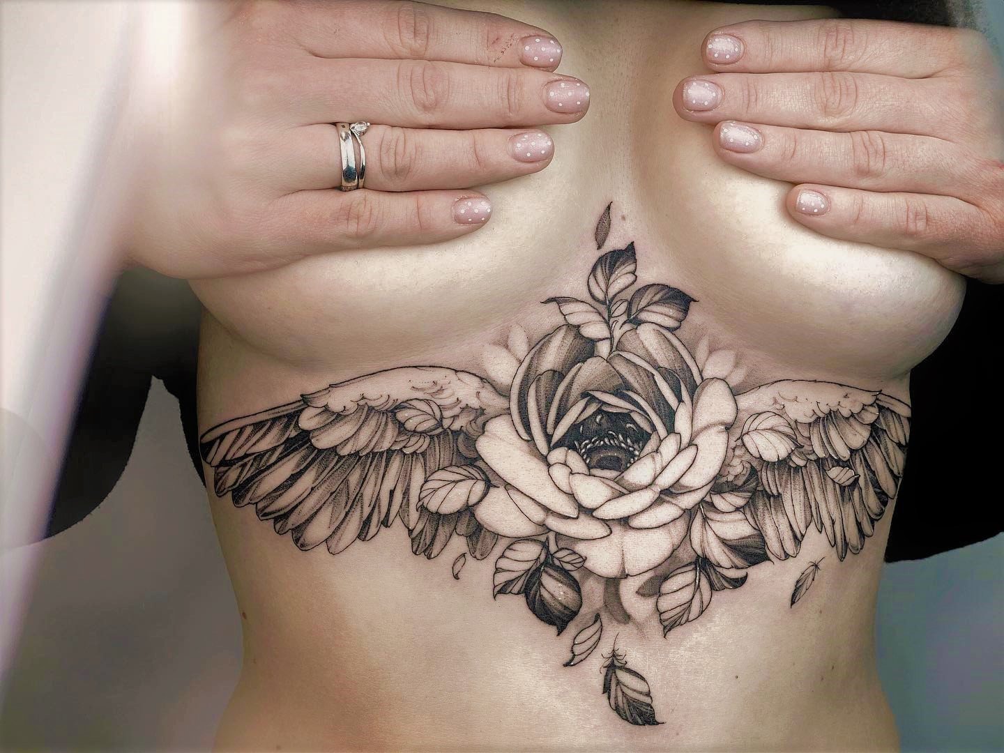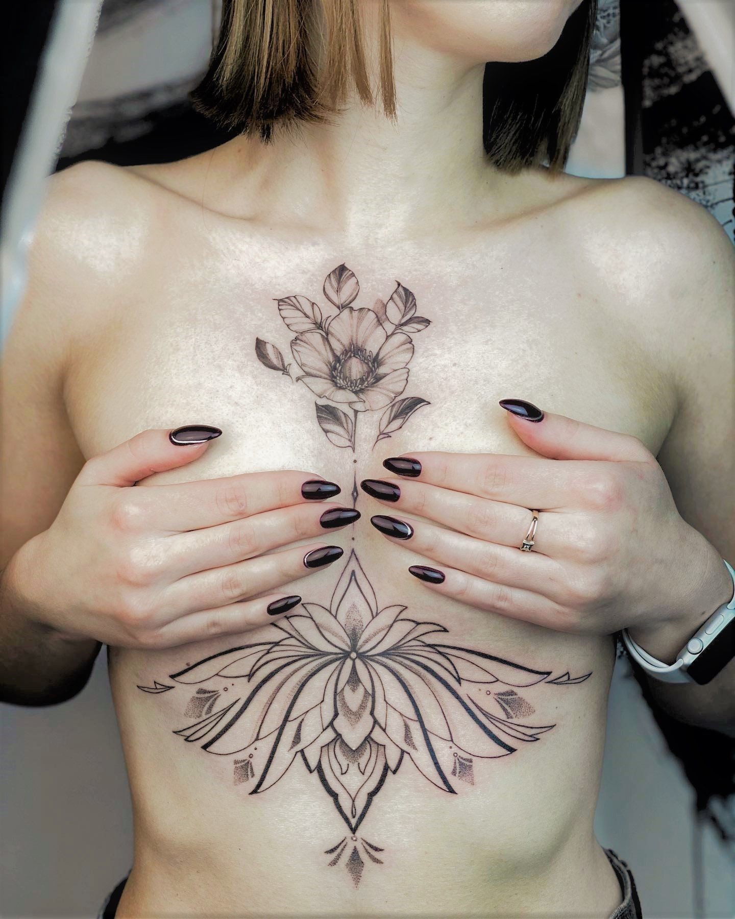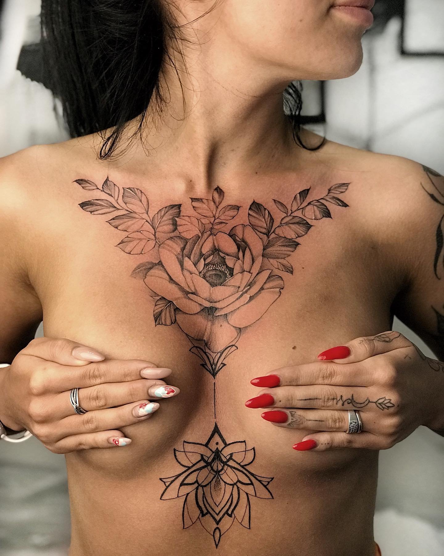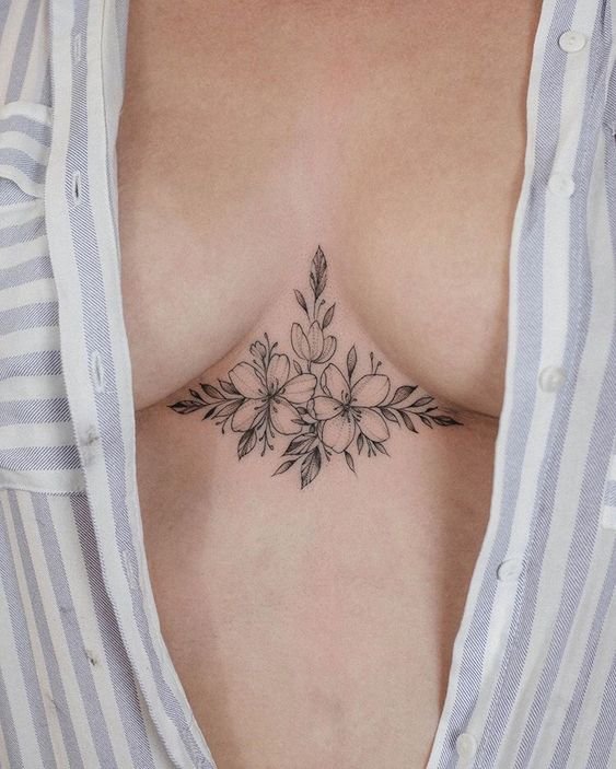 Small tattoos look low-key, and the procedure of applying takes less time. You also can use minimalistic drawings of flowers which will look stylish and cute. Girls often place black and white linework and dotwork tattoos under their breasts. Much less common are bright old school and watercolor designs which look catchy and spectacular on the female body. Between the breasts, on the sides or directly under the sternum are applied roses, peonies and sunflowers. These flowers are symbols of sophistication, love, beauty and grace. The rose in the middle of the chest looks incredibly tempting.