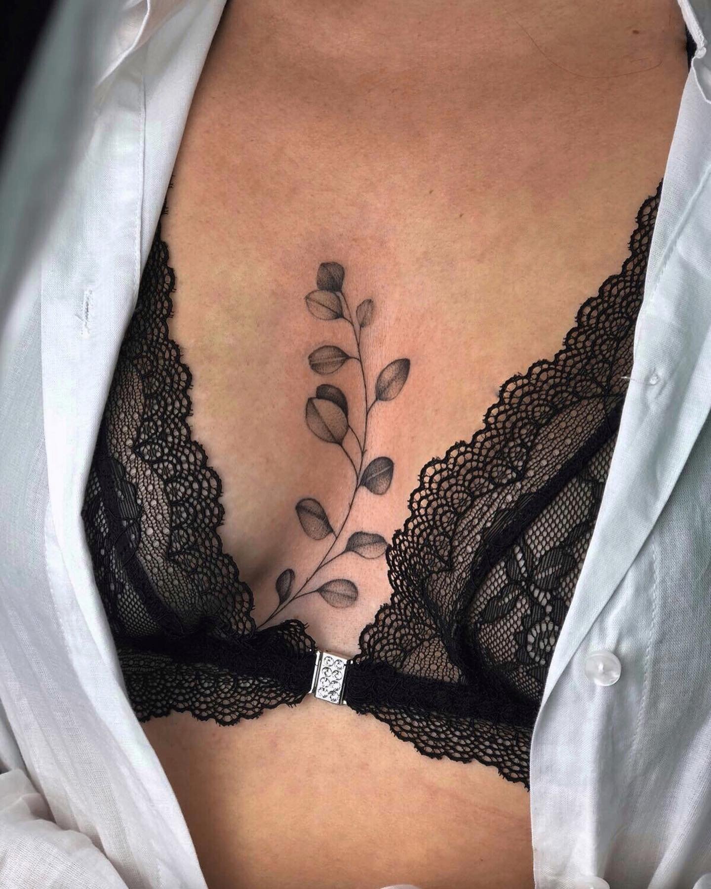 - Fine-line is one the trendiest style. The main feature of the style is the creation of fine lines with soft shading, in black and gray tones. Tats in this style can be different sizes, but it is small designs that win people's hearts. They are ideal for those who want a delicate sternum tattoo that can be easily hidden.