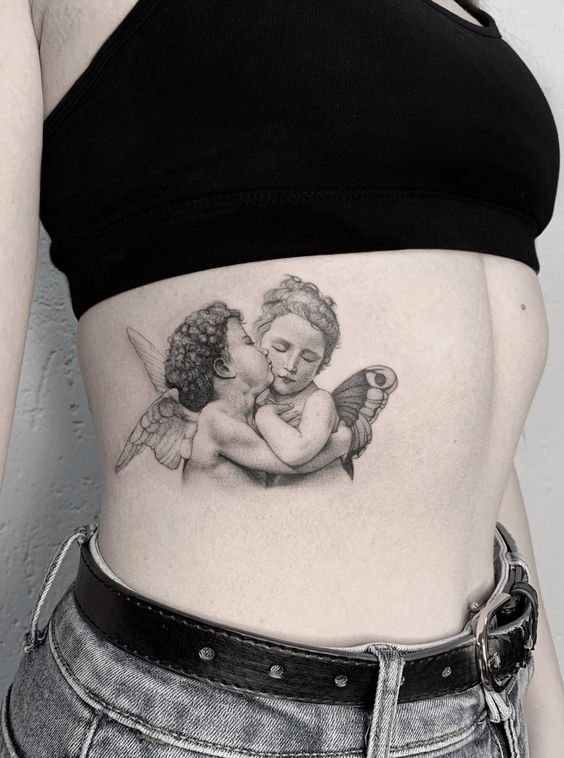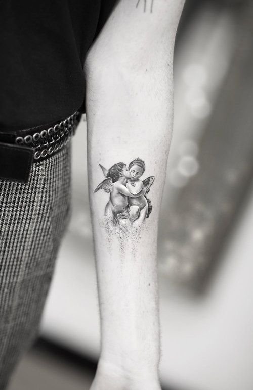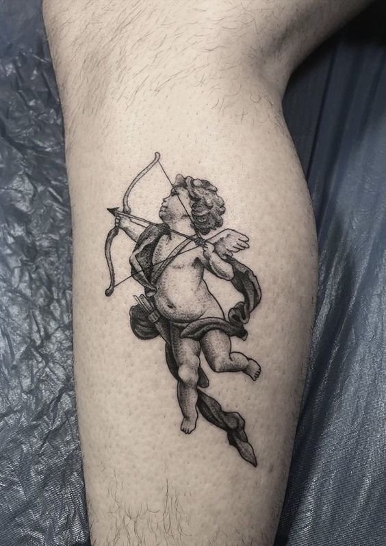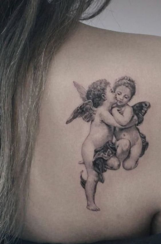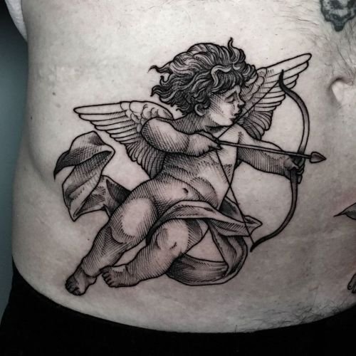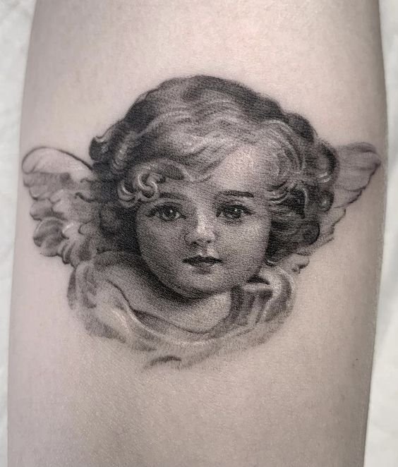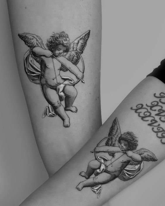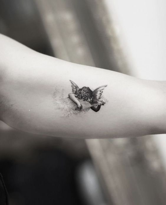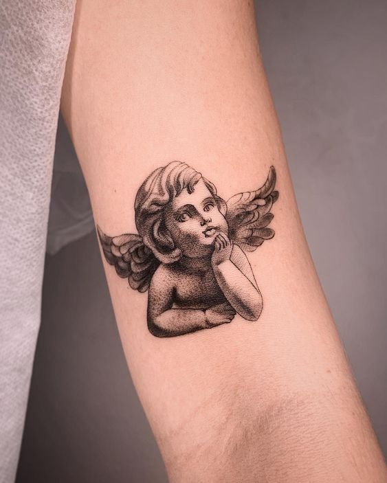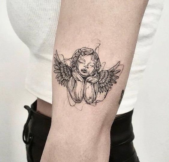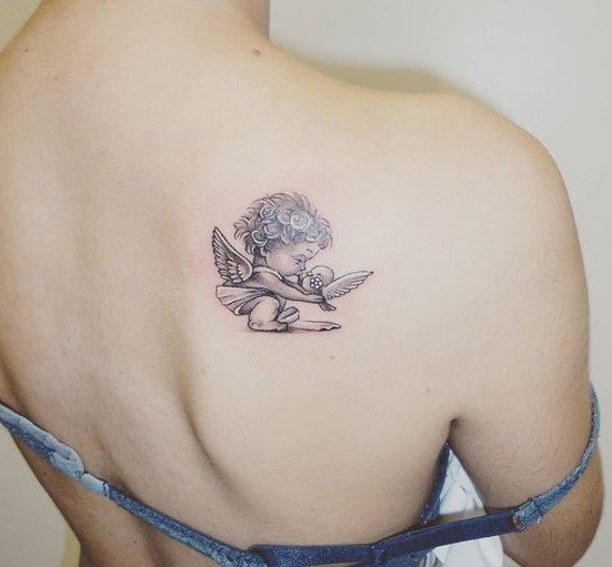 - Cherub. It often has the appearance of an innocent child with small wings. The main task of such an angel is to protect a person from darkness. The most famous and popular cherub in tattoo sketches is Cupid. He personifies love and protects a person from unhappy love. Innocence is the main feature of such angels. That is why such tattoos are very popular among girls.