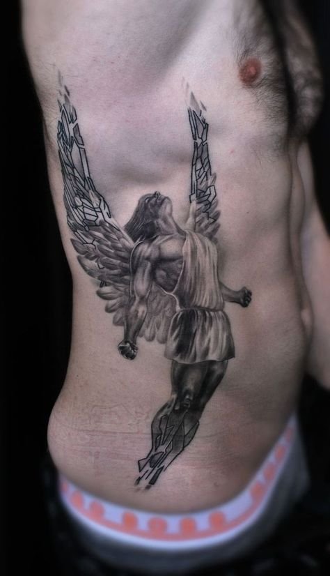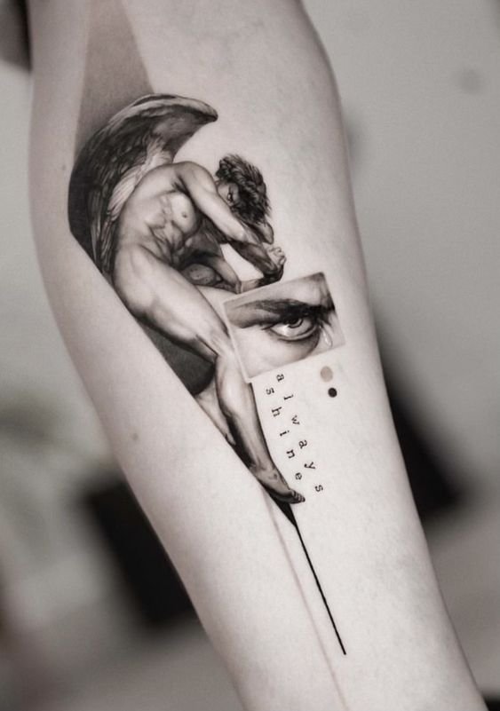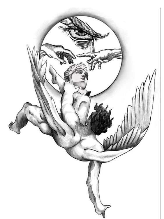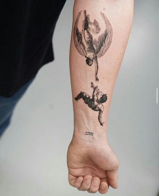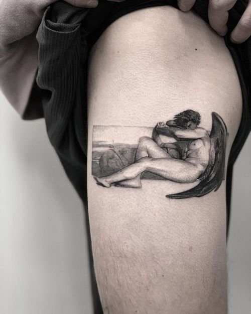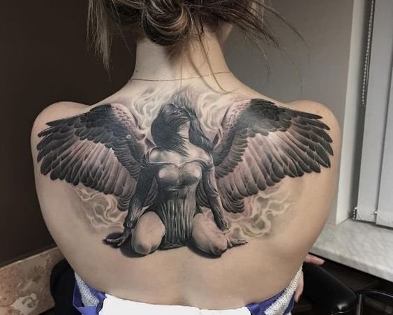 - Fallen Angel. An angel banished from Paradise for his mistakes symbolizes man’s dark past. Getting such a tattoo, the owner shows that he/she made mistakes in the past that he/she now regrets. One of the most popular fallen angels is the Grim Reaper. He always has dark black wings. The main task of such a tattoo is to remind the owner of death and teach the value of every minute of life.