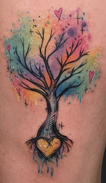- Traditional family tree tattoos often depict a large tree with branches depicting family members' names. Often, they are performed in a realistic style with bright, saturated colors.