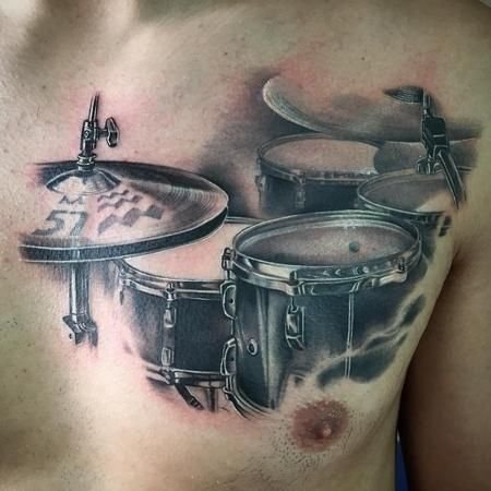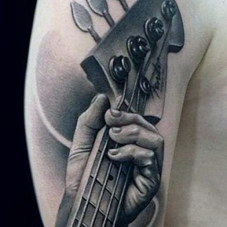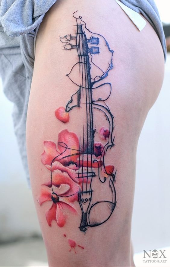 - Realism. Creating realistic musical instruments is not an easy task. To perform this work will have to find a good master and spend a lot of time in the salon. The result will not be disappointing - a drawing that conveys details, strokes, the play of shadows will become a decoration of the body.