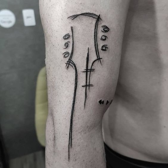 - The upside-down violin key next to the guitar together form a heart. The body image symbolizes a passion for music.