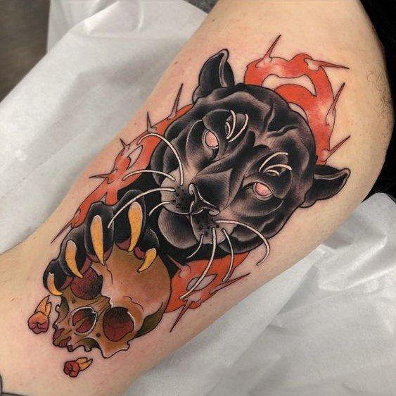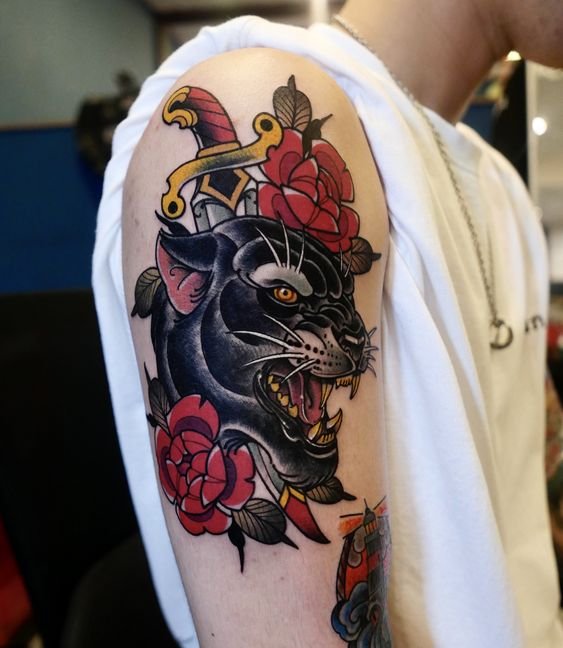 Some panthers look aggressive and fierce, others look funny and good-natured. In the Traditional style, the body image is made in black colors. Experienced masters skillfully transfer the protruding animal muscles, shine and beauty of the glossy wool. The head of the panther looks good in the style of Traditional and Neo Traditional.
