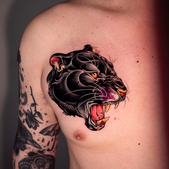 Panther tattoos in the New School style is a life-affirming, positive body image that helps to take your mind off everyday life and keep the love of life. The most popular New School character is the Pink Panther, the hero of a famous animated film.