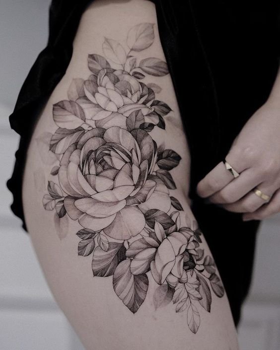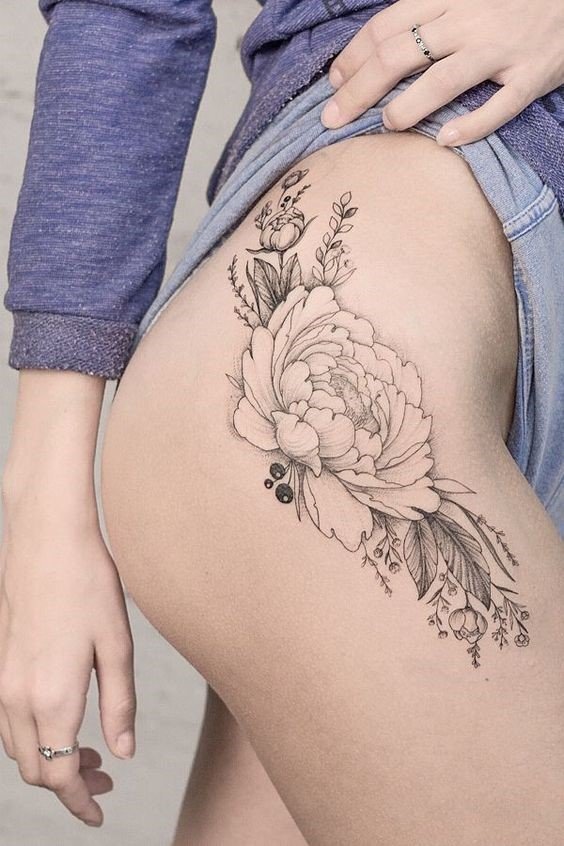 - Thigh peony tattoo: Such a location is more popular among women, and that’s quite predictable. Floral sketches look especially charming and elegant on legs and are usually done for a visual reason;