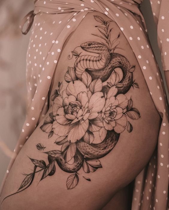 If you are not a fan of so sweet and cute tattoo sketches, think about combining peonies with animalistic elements. Floral tattoos with snakes and predators like wolves show the reserved but powerful nature of a person.