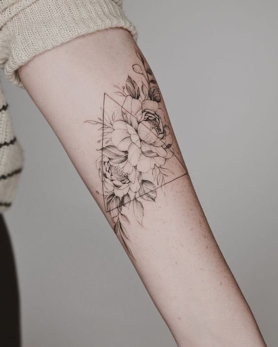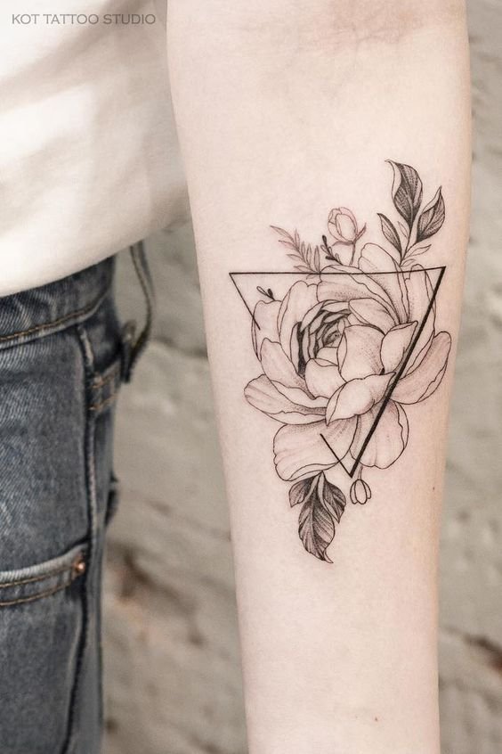 Moreover, you can often see peony tattoos depicted in a triangle. To understand what such a tattoo means, you need to understand the interpretation of such an image as a triangle. In all cultures, the triangle is interpreted from the point of view of religion and philosophy. It is believed to be a symbol of wisdom, spiritual strength, and unity of the feminine and masculine. The meanings of the triangle and the peony are very similar and mean wisdom in simplicity, chastity, morality and strength.