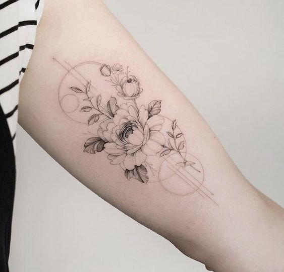 Male peony sketches may also include gun illustrations and sophisticated geometrics. Men usually opt for black-coloured floral ornaments of large sizes.