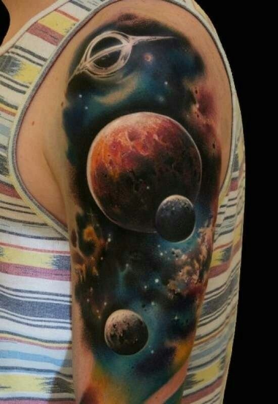 The space theme is ideal for creating a sleeve. The back and chest are the ideal place to place a large-scale tattoo with plenty of details. Small tattoos are made on the shoulder, wrist, ankle, back palm or foot.