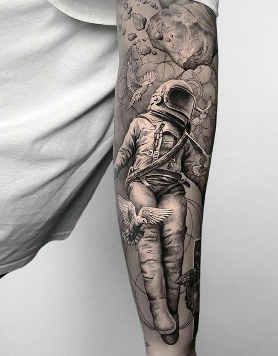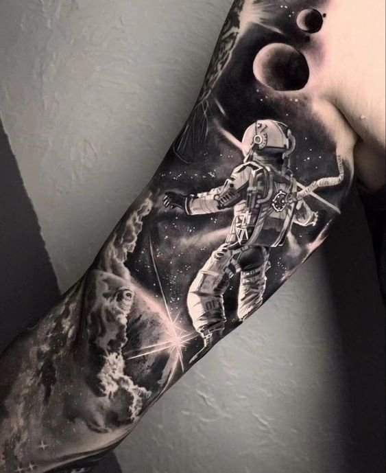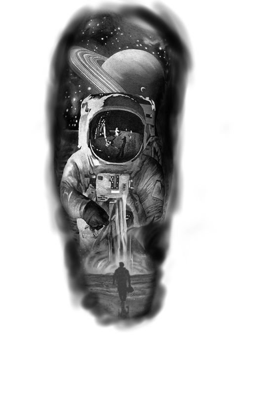 By adding inscriptions and details, you can personalize the body image and make it unique. The cosmonaut’s tattoo can be large or small, stand alone or be part of a large composition - sleeves.