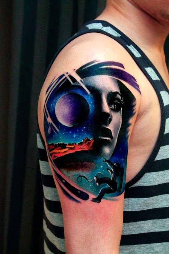 Others choose cosmic tattoos inspired by a movie they have seen or read a book where the main characters are astronauts or conquerors of intergalactic space. The presence of the body image indicates the owner’s interest in the space theme.
