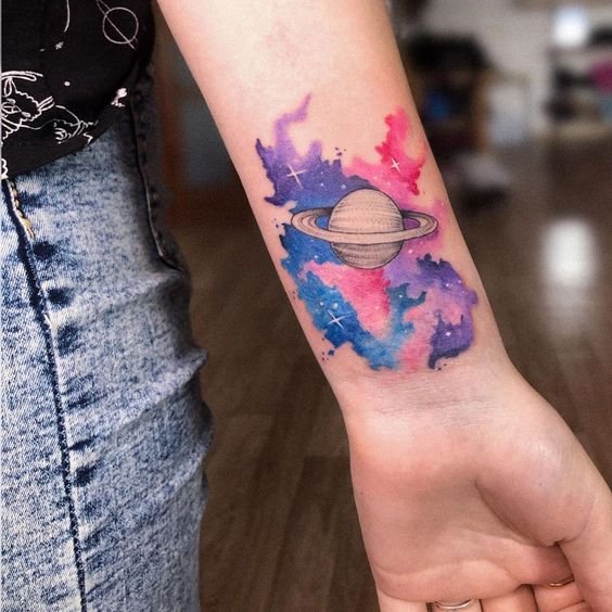 - Watercolor. Colorful tattoos that resemble watercolor painting perfectly convey the atmosphere of the cosmos.