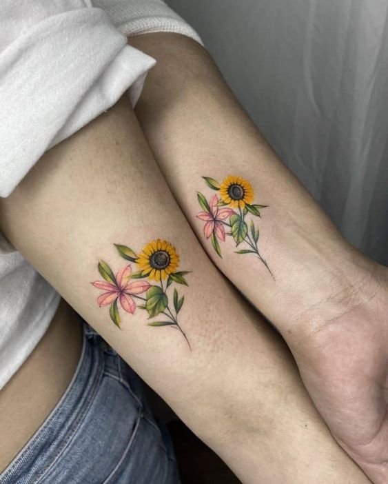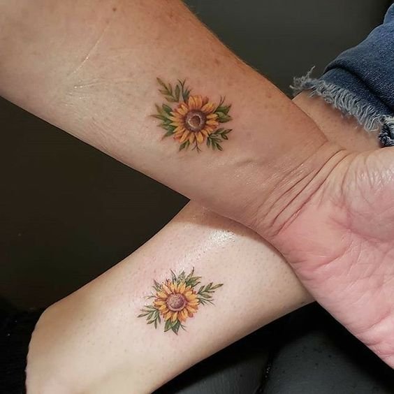 The flower image is a great idea for a paired tattoo that emphasizes affection and tender feelings for a lover, friend or relative. Sunflower - a symbol of love and warmth, in the pair tattoo this value increases. To personalize the plot, add dates, quotes, names or initials of loved ones.