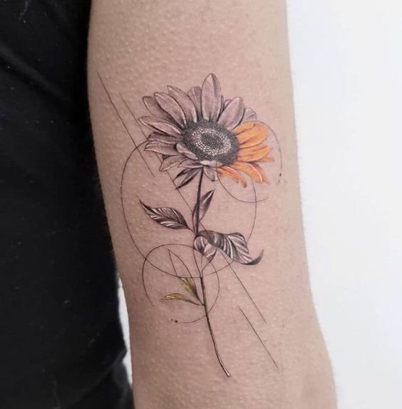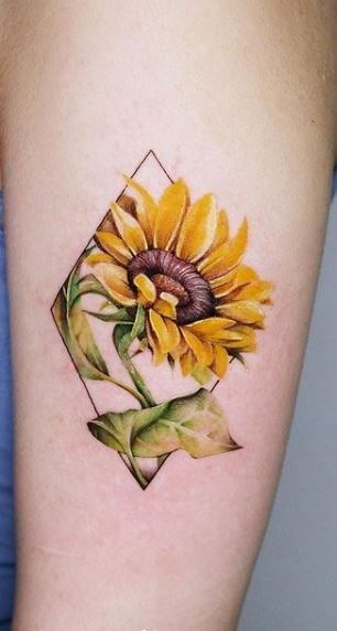 To perform sunflower tattoos suitable any styles - Realism, Traditional, Blackwork, Minimalism, New School. The choice depends on your wishes and preferences. If you want to make a trendy tattoo, choose a Geometry style. These body images represent the balance and strong symmetry in your life. Minimalist storylines are suitable for all people regardless of social position, position, gender and age.