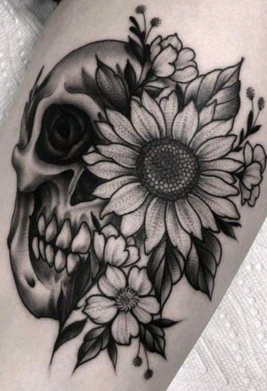 - The skull, placed in the center of the sunflower, symbolizes life and death, blossoming and withering, strength and weakness. The original plot is suitable for creative people who are looking for non-standard solutions.