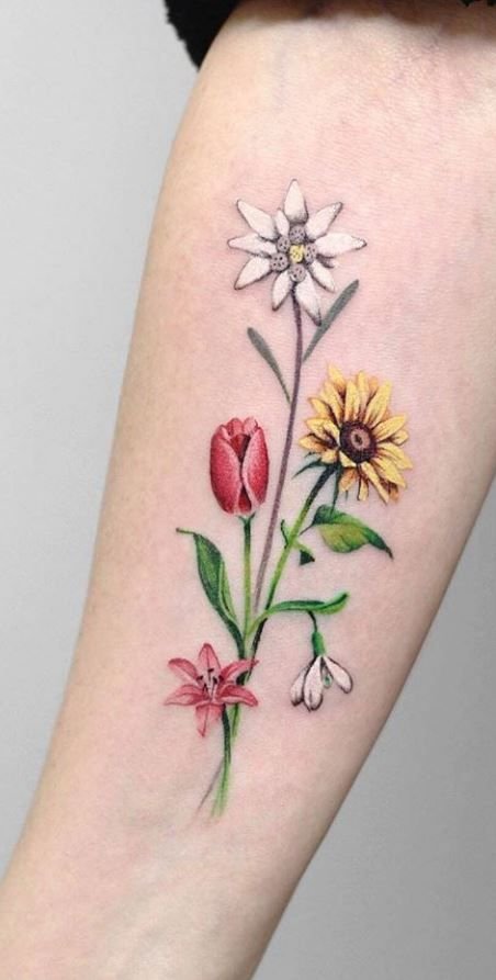 The alternative is a bouquet of flowers or a field of growing sunflowers. Other flora - roses and daisies, dandelions and irises - are combined with the sunflower. Depending on the choice of the adjacent plant, the values vary. The tattoo of sunflower with a rose symbolizes tenderness and nobility, with chamomile - openness and fidelity to family values, with dandelion - lightness and fleeting life, tenacity and fulfilment of dreams. If irises are present in design, tattoo means sincerity and spirituality.