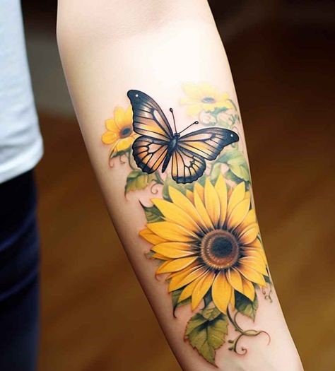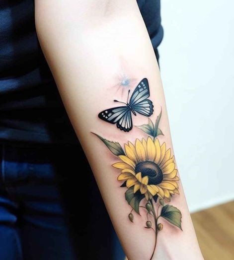 - Add detail. Flying butterflies, frozen on the leaves and petals of ladybugs climbing the stalk of caterpillars - original elements that give additional meaning. Sunflower tattoo with butterfly means desire for freedom and change, with ladybug - pleasant news, abundance and patronage of higher powers, with caterpillar - wisdom and reincarnation, eternity and patience.