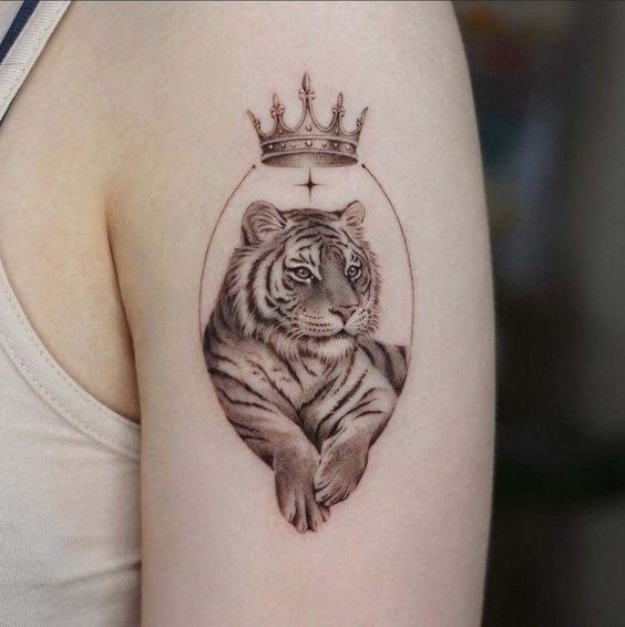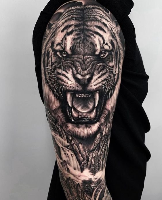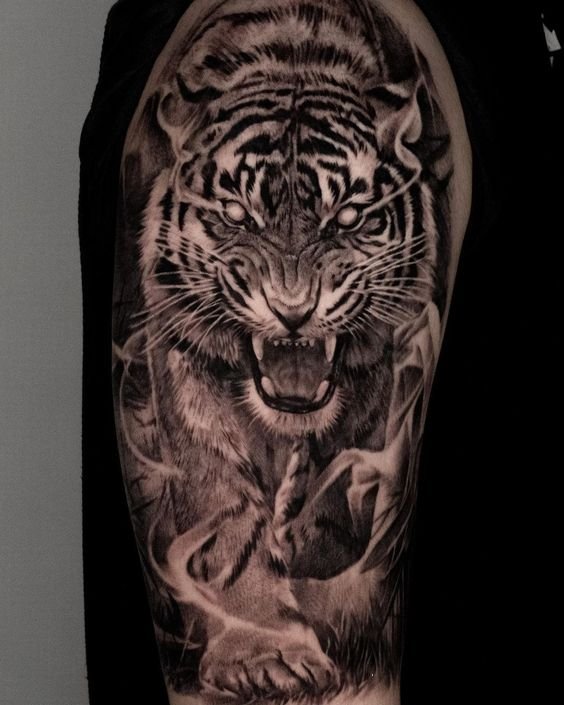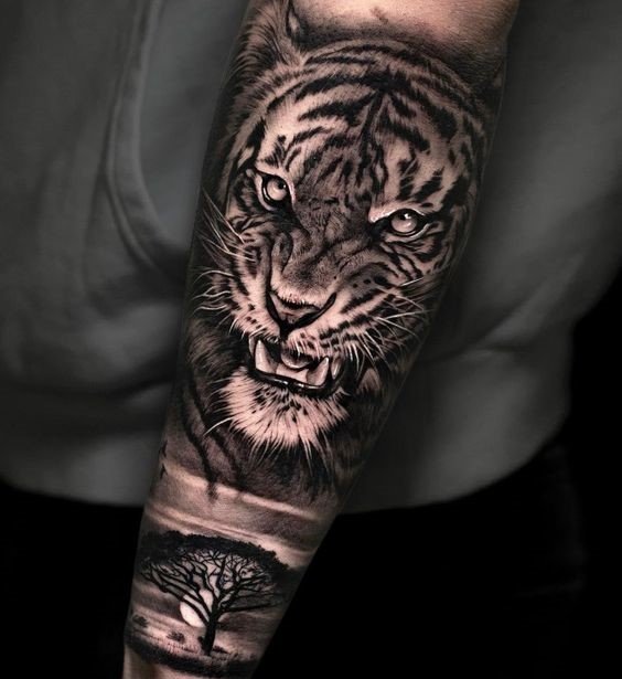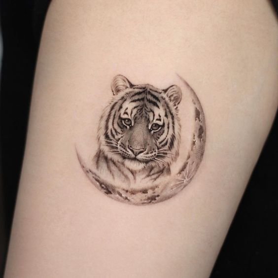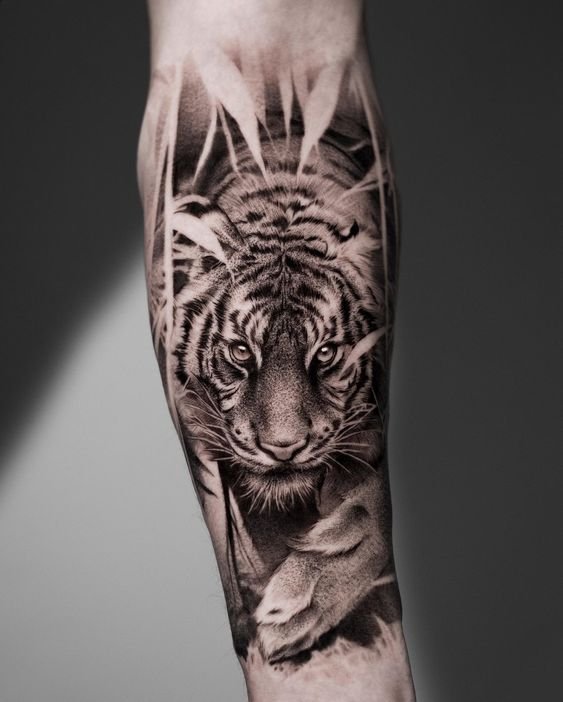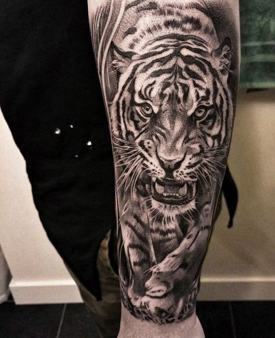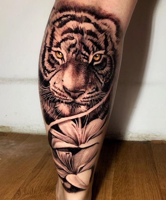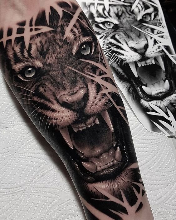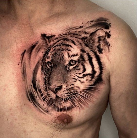 Tigers have great strength, freedom and independence. It symbolizes the element of wind, which moves freely in any direction. Chinese-style tattoos are often created on detailed, colorful backgrounds. The hieroglyph Han, which means «king», is often depicted on the forehead of the animal. The tiger in Chinese culture is a mystical animal with supernatural powers and abilities.